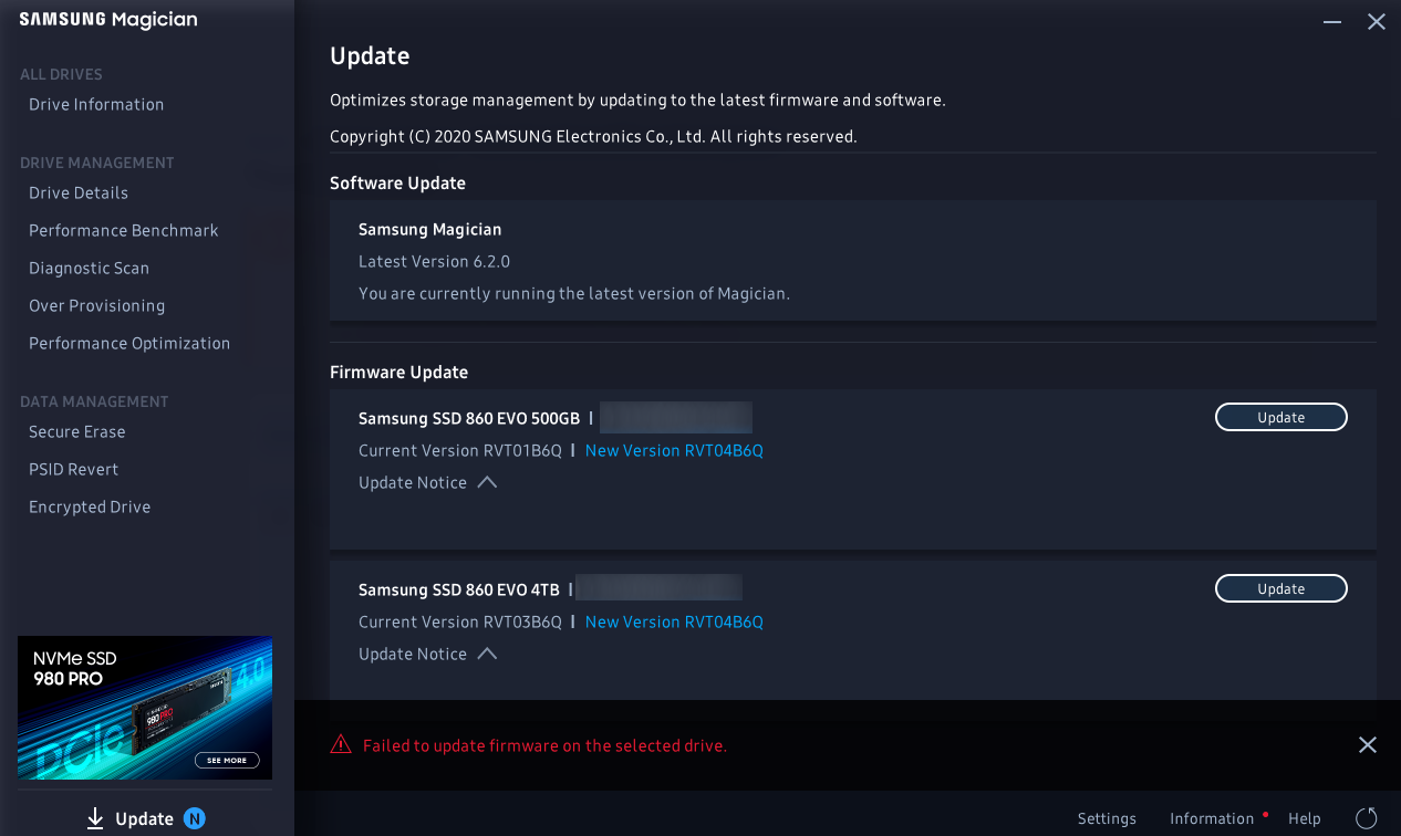With the Magician software open you need to select the drive you want to update which the software should automatically have done anyhow and then click on firmware update. The same command can update Samsung SSD. The companys Samsung Magician Software was updated to version 46 recently.