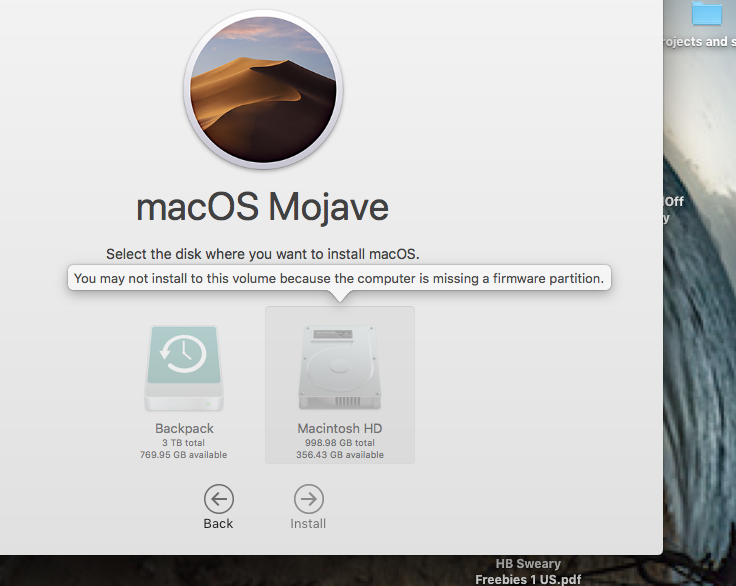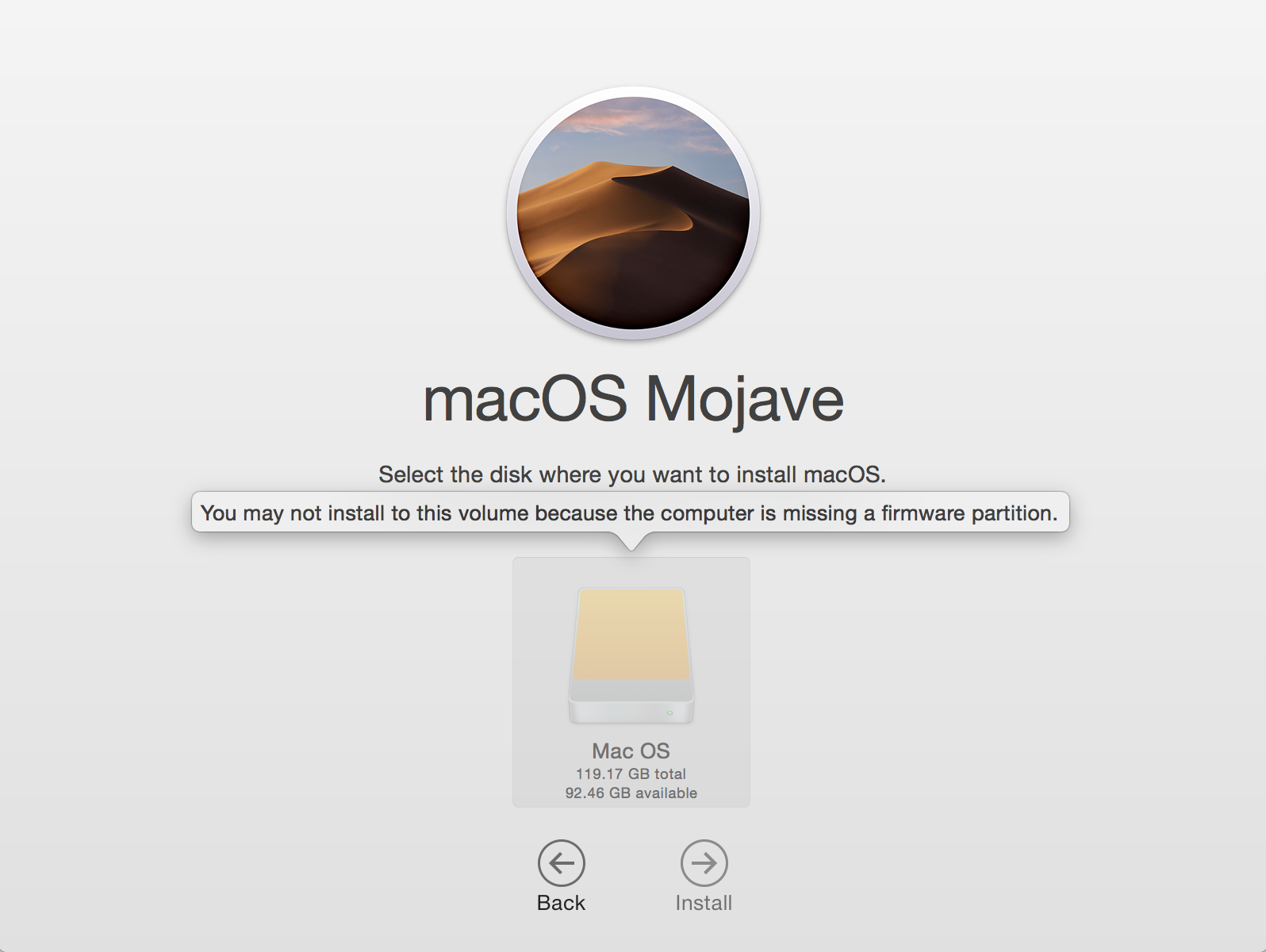 Solved Mojave Won T Install On Ssd You May Not Install To This Volume Because The Computer Is Missing A Firmware Partition Macrumors Forums
