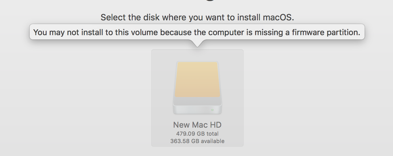There I found the firmware mbp101whatever I mentioned above. I know you are installingupgrading an external drive but the macOS installer forces this requirement. I have downloaded the installer and every time I start it and click on next it asks me to choose a location and I cant select the drive because it is greed out and when I click on it it says A firmware partition is missing therefore mac os cant be installed on this drive.